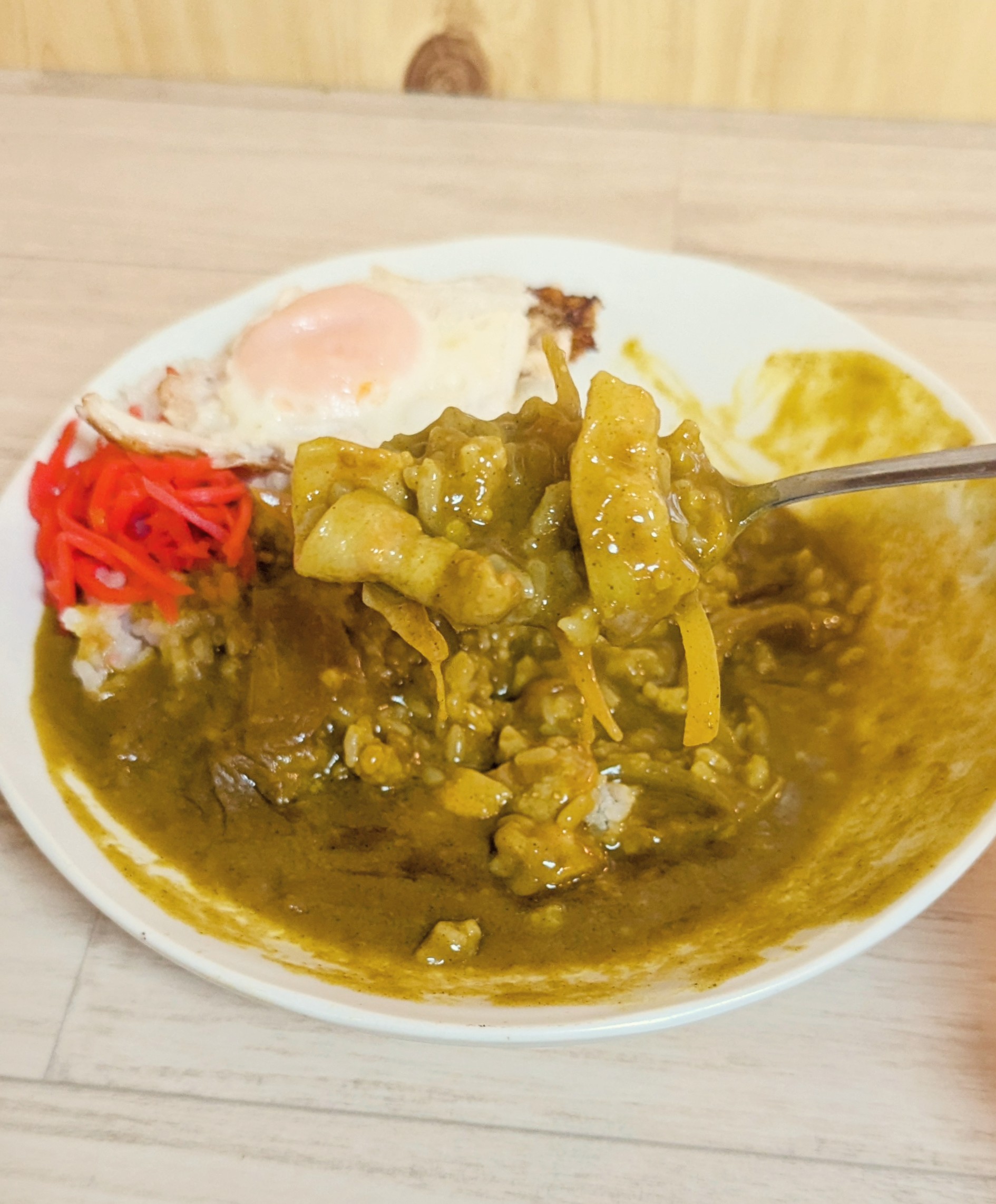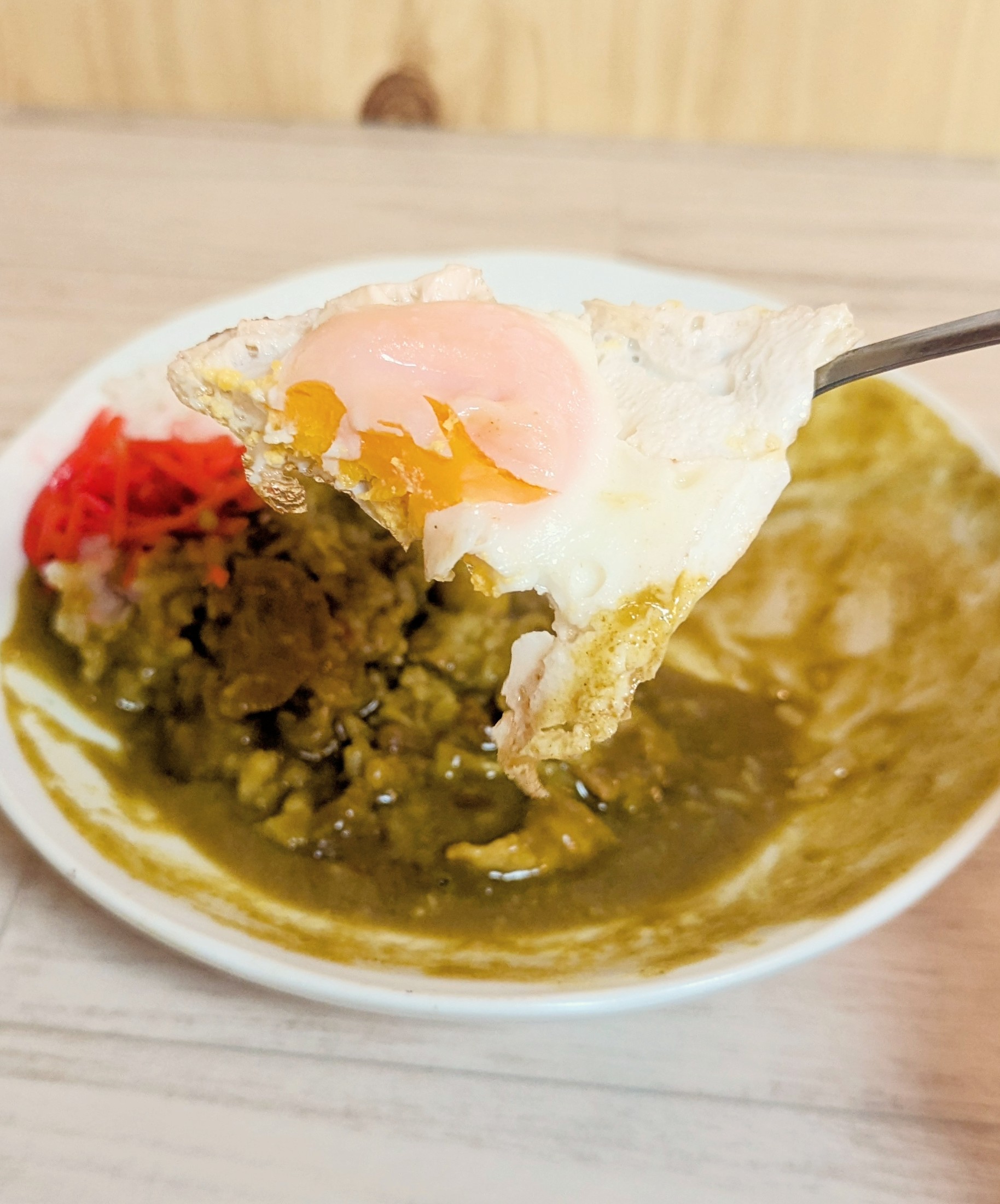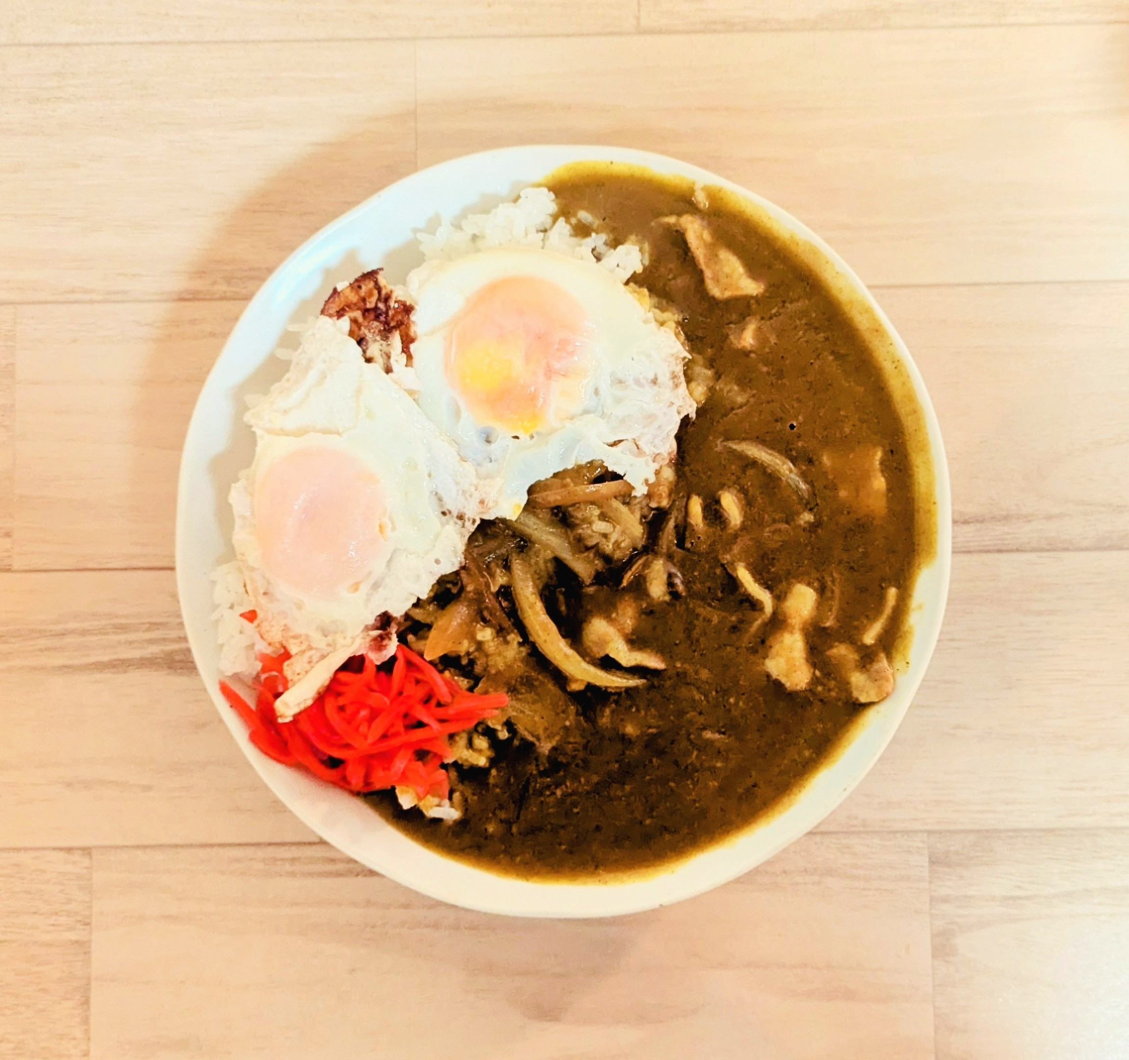 先日はカレー蕎麦を頂戴したので。そしたら次はカレーライスですよね。目玉焼きのせちゃいました(苦笑)。