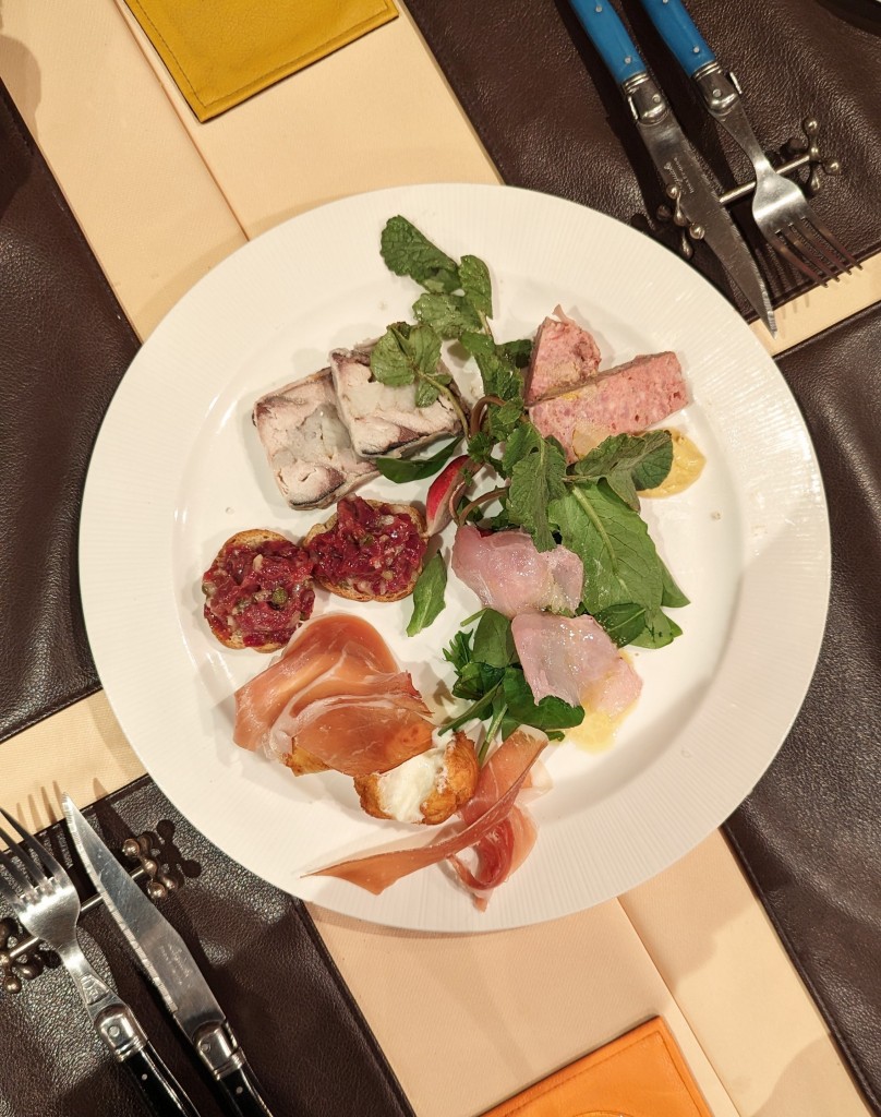 「馬肉のタルタル ブルスケッタ」「コッコリ(モッツァレラチーズ)と生ハム」「石鯛のカルパッチョ」「鯖と里芋のテリーヌ」「岩中豚(岩手)とフォアグラとピスタチオのパテ」