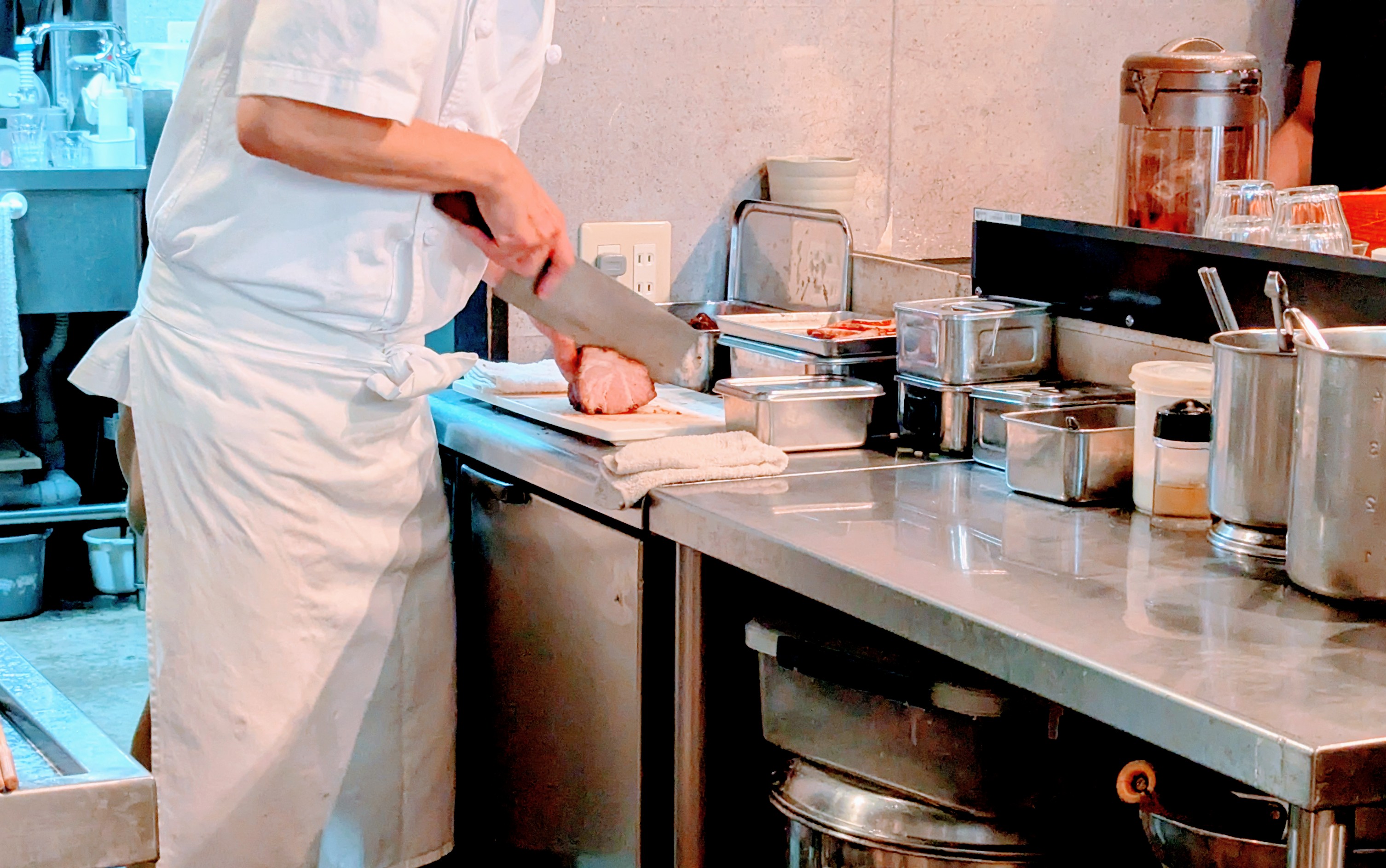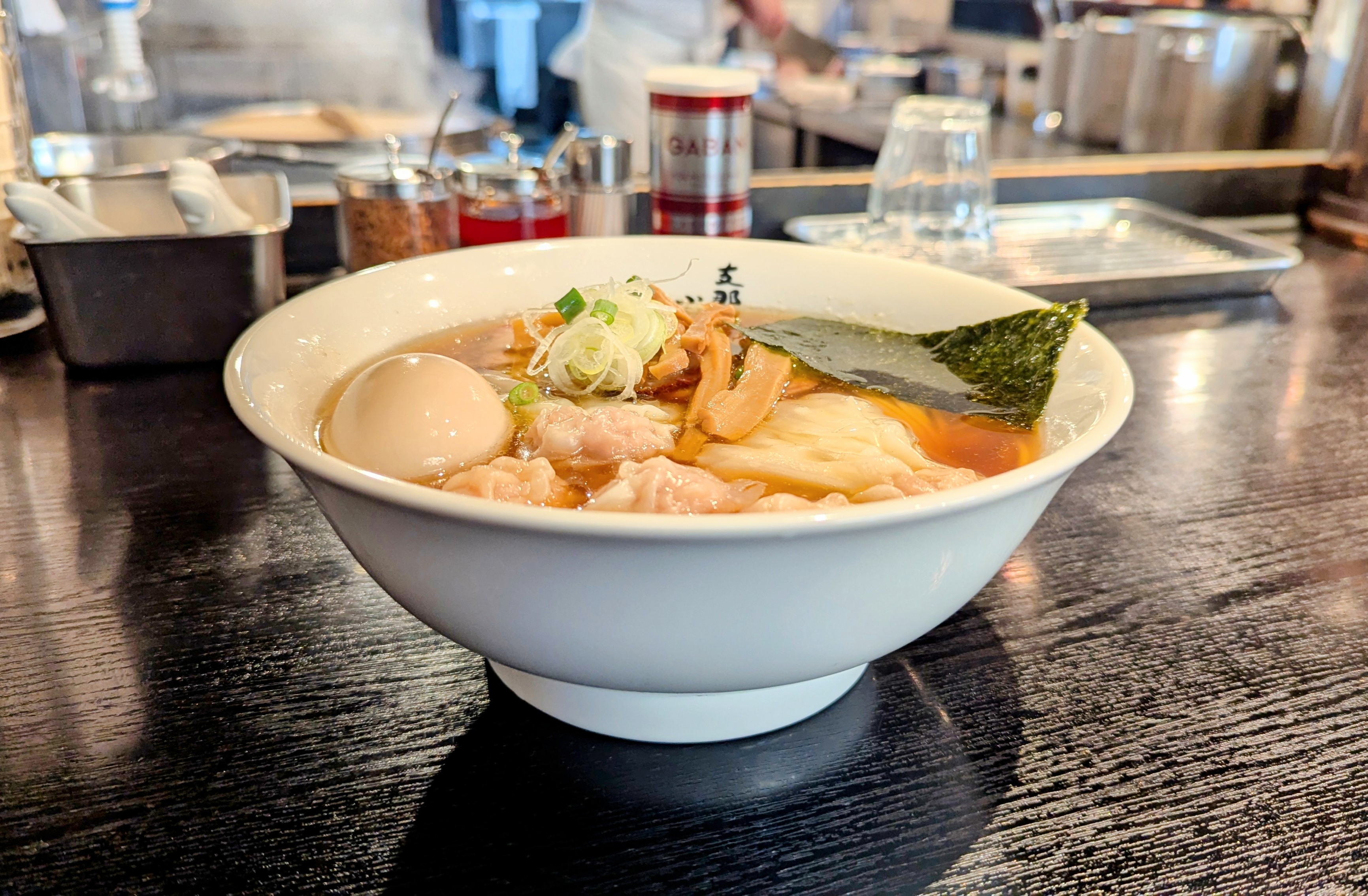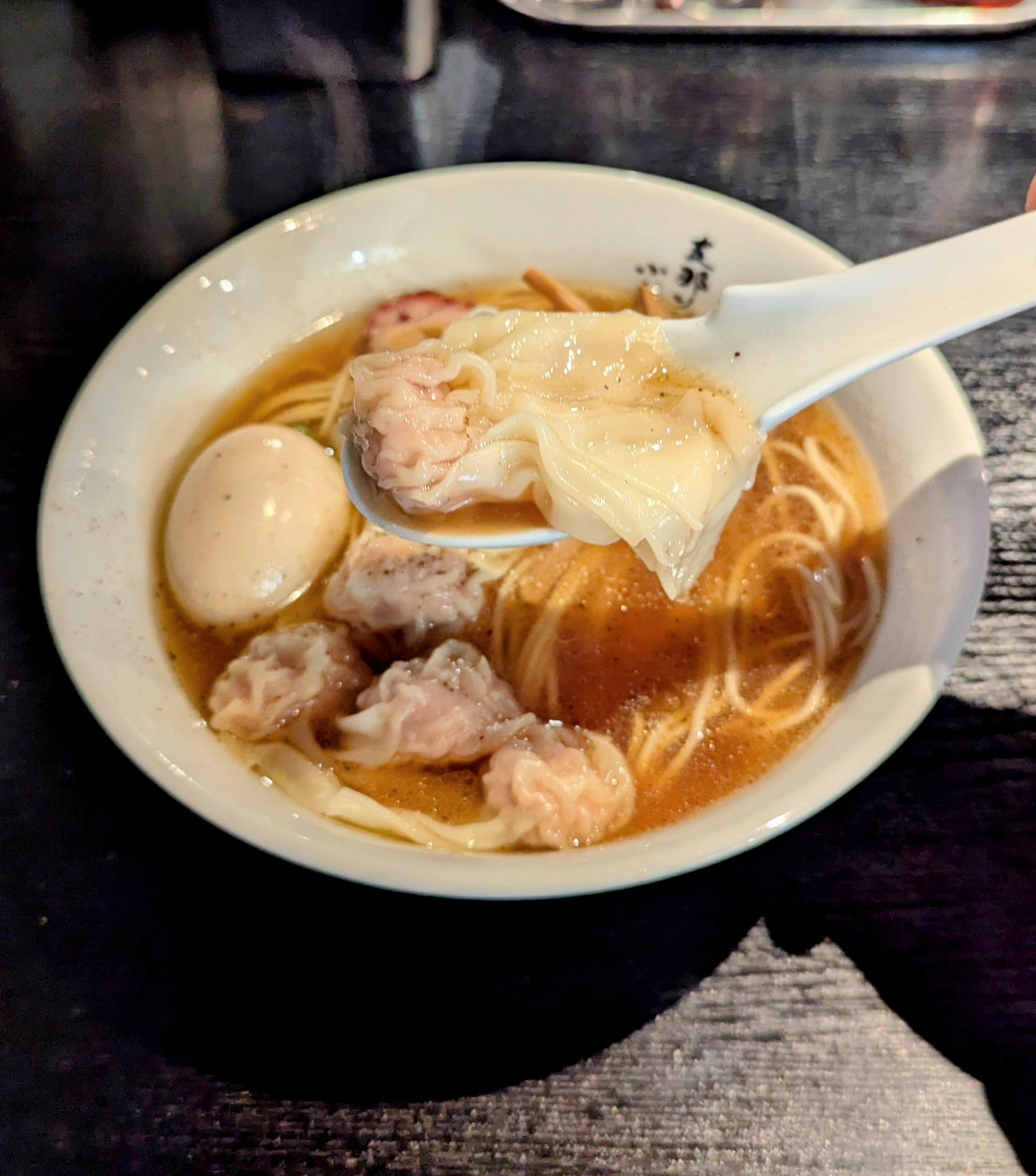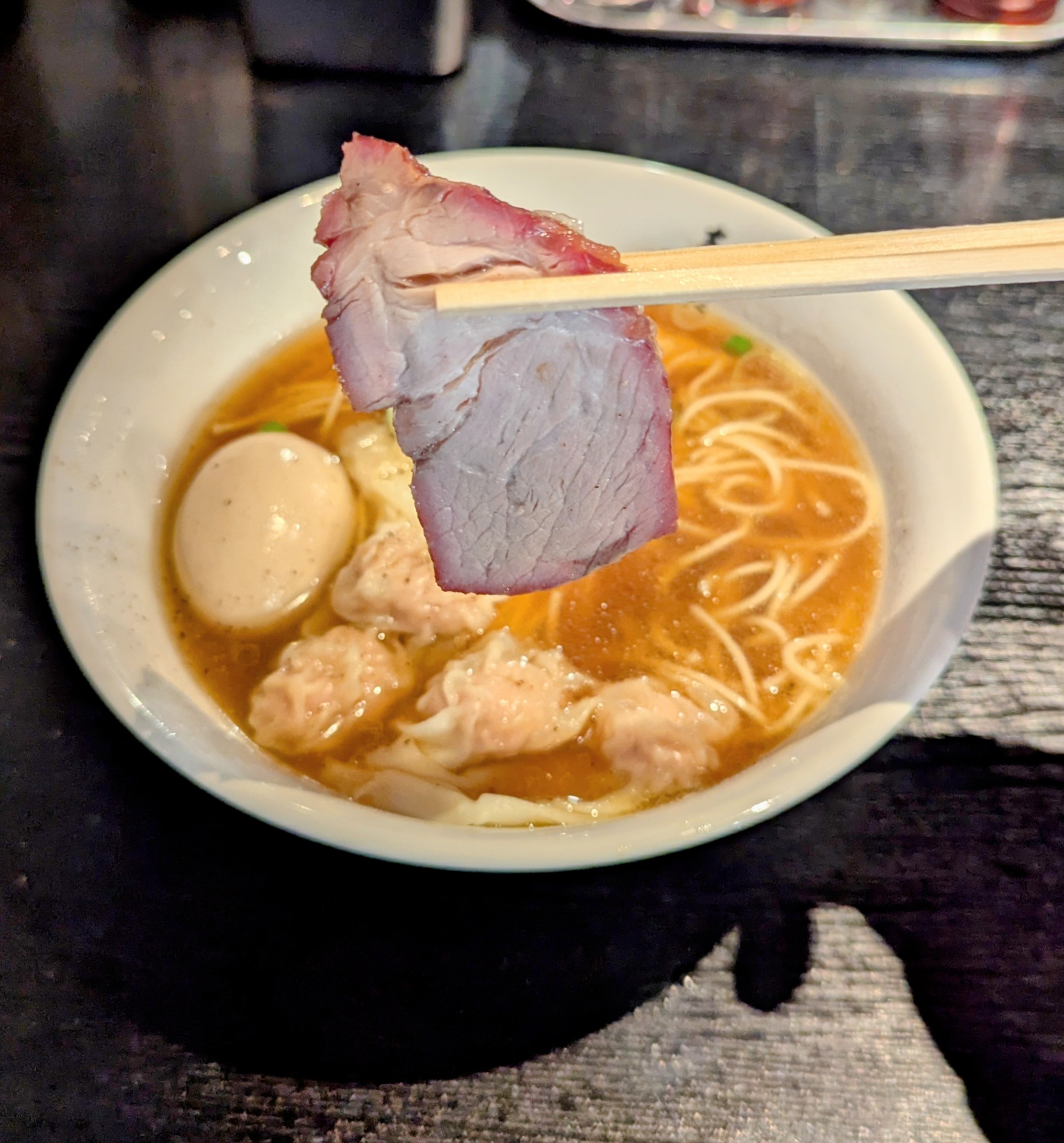スープは鶏ガラ、豚ゲンコツ、香味野菜からのスープと、昆布、煮干し、混合節からの和風出汁をブレンド。つるつるの麺とワンタンの皮は自家製。ワンタンは肉々しくも生姜の風味が素敵です。豚肩ロースのチャーシューは美しく焼き上げられています。