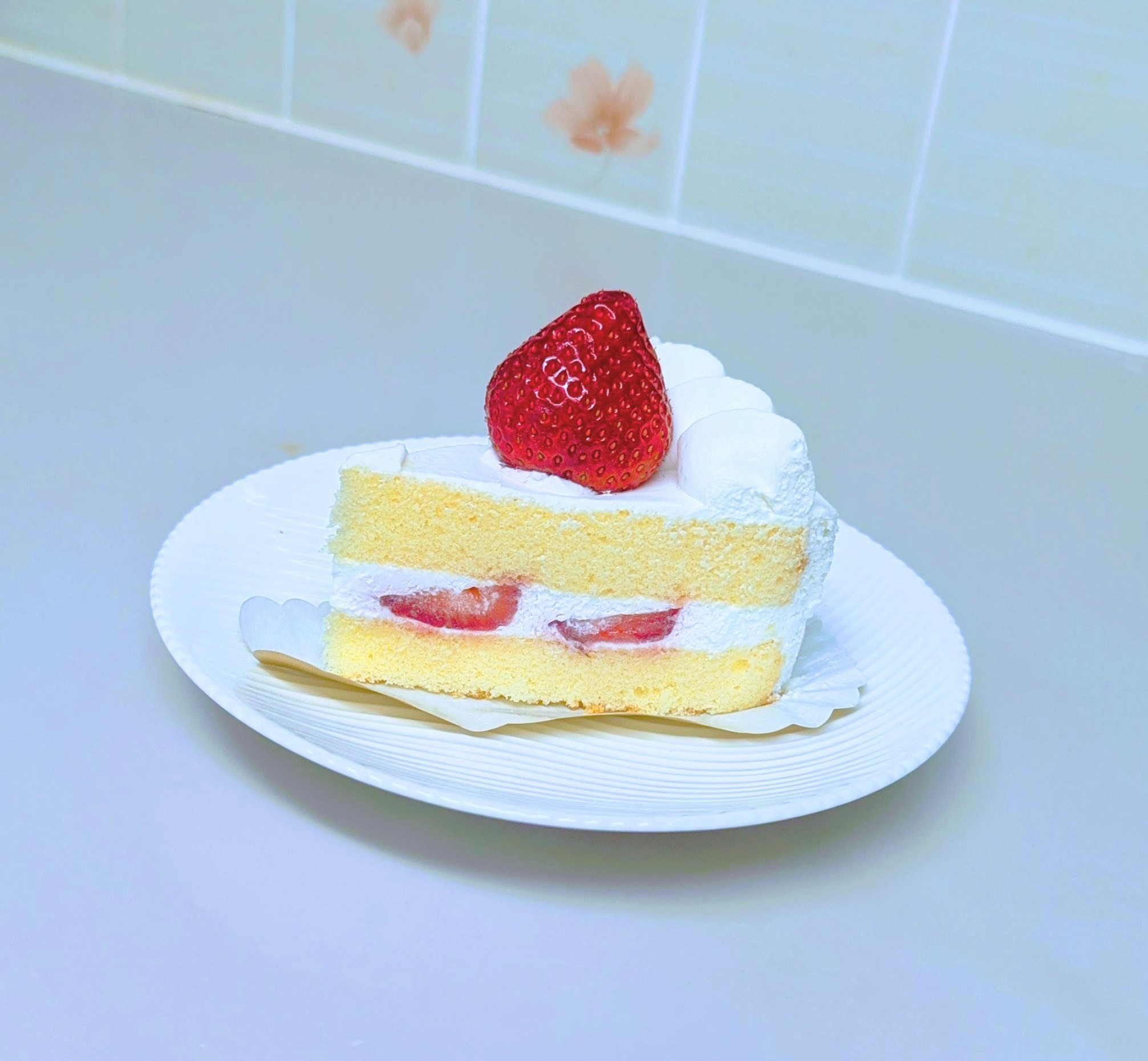 クリスマス限定のあまおう苺のショートケーキです。あまおう苺がめっちゃ大きいんです(喜)。ペコちゃんがいないのですが。。。