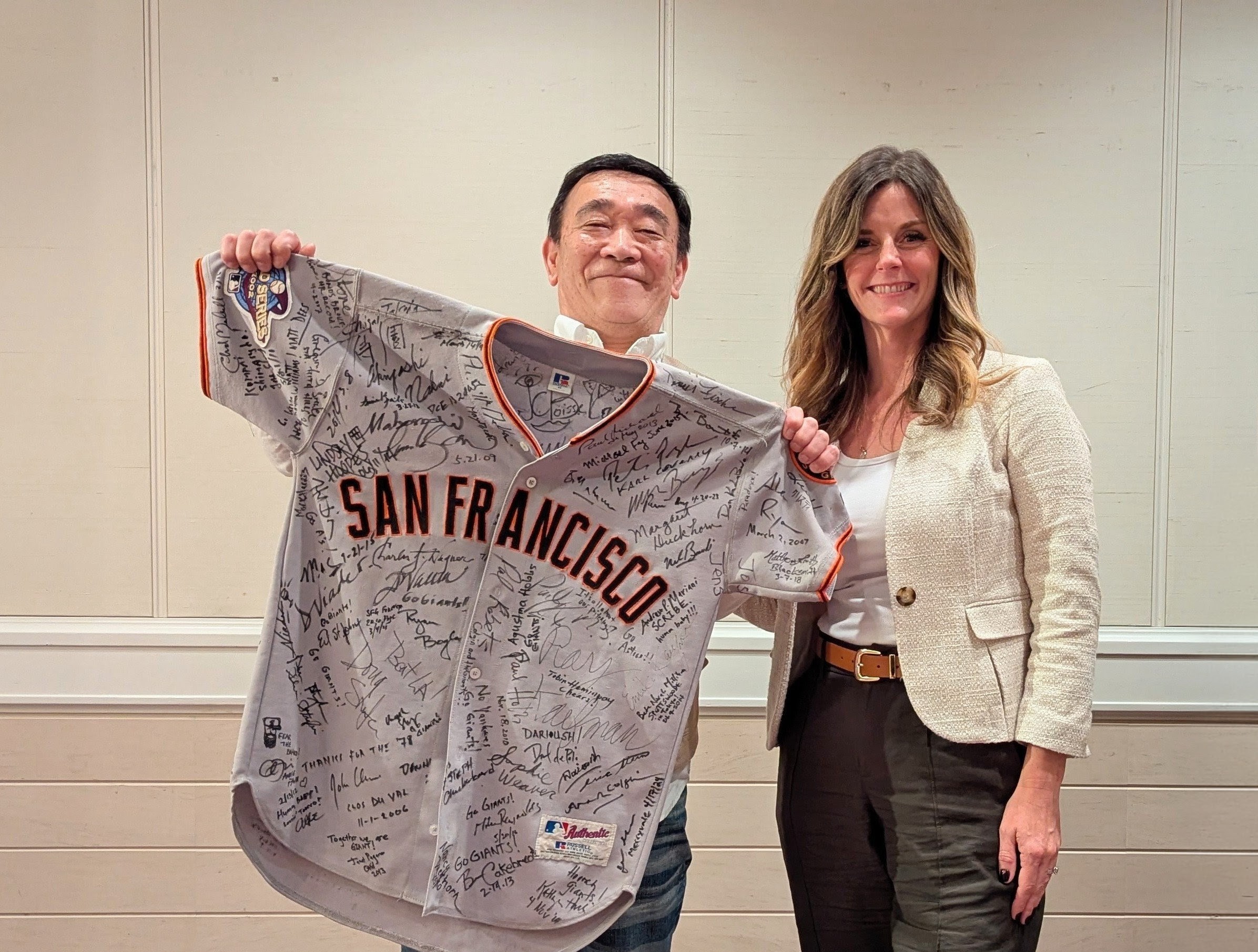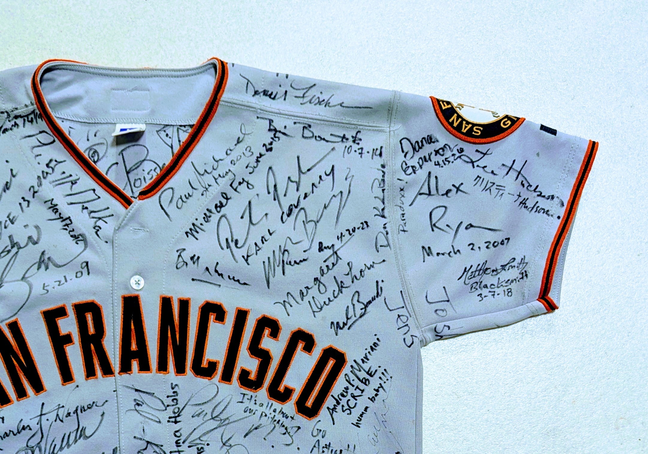右袖はエリア・ダックホーンです(苦笑)。デイナさんのサインがダックホーン関係者13人目のサインとなりました(大苦笑)。デイナさんのサインはジャイアンツのパッチ(ワッペン)の左下に。