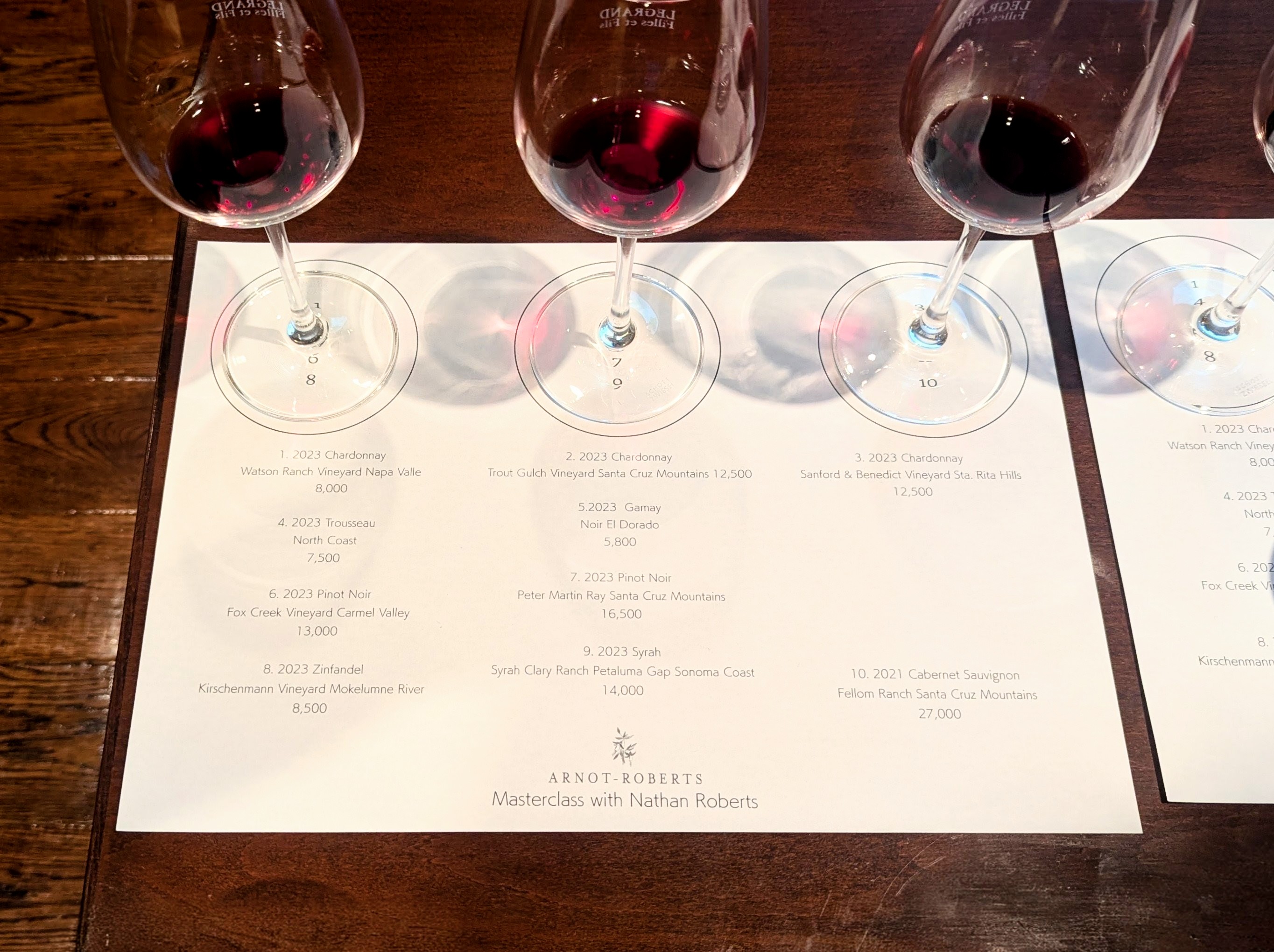 セミナー終了後に、ソーヴィニヨン・ブラン、リボッラ・ジャッラ、シラー(カリフォルニア)、2度目のリリースとなるレッドワインも試飲できました。2022年レッドワインは、57%カベルネ・ソーヴィニヨン、22%カベルネ・フラン、21%メルローのブレンドで、ニュートラルのフレンチオークとコンクリートタンクで熟成されました。ソノマ・ヴァレー、チョーク・ヒル、ルシアン・リヴァー・ヴァレーの3つの畑のブレンドで、個々に収穫後発酵されました。ソノマ・ヴァレーの畑はあのベッドロック・ヴィンヤードで、カベルネ・ソーヴィニヨンとメルローが使われました。