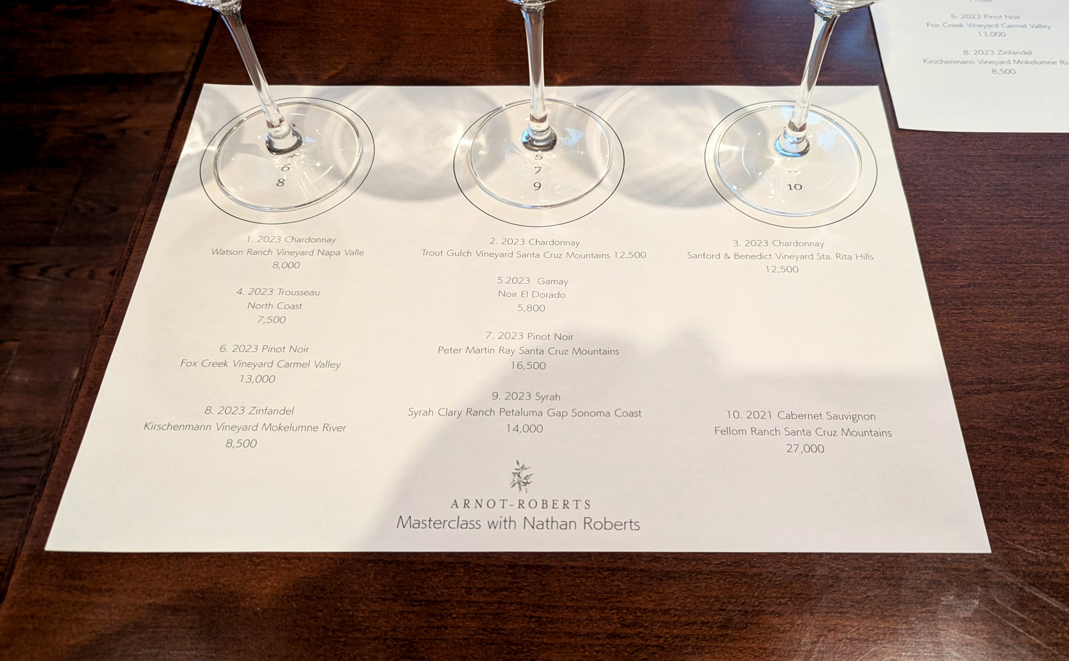 個人的に非常に興味深いジンファンデルでした。サクラメントの南、ロダイに近いモカルミー・リヴァーのカーシェンマン・ヴィンヤードです。1915年に自根で植えられた畑はジンファンデルの他にカリニャンやサンソ―などが点在しています。現在はターリーのワインメーカーを務めるティーガン・パサラクアが管理しています。ティーガンはベッドロックのモーガン・ピーターソンと同じく古樹を守る保存する活動をしています。この地は冷涼地の中では比較的温暖な地域ですが、近くを流れる川が冷涼効果を生み出しています。ジンファンデル、カリニャン、サンソ―、モンドゥーズ・ノワールのフィールドブレンド。鮮烈な赤い果実味です。美味しいです。今回のテイスティングで一番印象に残ったワインでした。アルノー・ロバーツと言えばシラーとおっしゃる方も多いと思います。クラリー・ランチ・ヴィンヤードは、トゥルー・ソノマ(真のソノマ)と言われる地域の1つであるペタルマ・ギャップに位置します。山脈と山脈の間にある地域で、非常に冷たい強い風が吹き抜けます。アルノー・ロバーツが使用するシラー畑の中で最も冷涼な畑で、アルコール度数は12%までしか上がらないとのことです。収穫も遅く、11月中旬までかかることも。2006年から生産しています。アロマティックでエキゾチックな風味ながら、豊かな酸が全体を引き締めています。最後に2021年のカベルネ・ソーヴィニヨンです。ダンカンもネイサンもナパ育ちなので、2人にとってやはりカベルネ・ソーヴィニヨンは欠かせないアイテムのようです。アルノー・ロバーツは初期からカベルネ・ソーヴィニヨンを生産しています。フェロム・ランチ・ヴィンヤードは、サンタ・クルーズ・マウンテンの標高670mに位置する畑で、あのリッジ・ヴィンヤーズのモンテ・ベロと立ち並ぶ畑です。1929年にフェロム・ファミリーが購入した畑で、ジンファンデルが植えられていましたが、1980年(~83年)にチャールズ・クリュッグ・ワイナリーの枝が使われ、カベルネ・ソーヴィニヨンに植え替えられました。ケーン・プルーニングング(梢剪定)という仕立てで栽培されています。葡萄の糖度が上がり過ぎることがなく、長い育成期を過ごします。2007年から生産しています。2021年は8樽のうち1樽が新樽です。深みと凝縮感がありますが、重くなくバランスの取れた仕立てになっています。