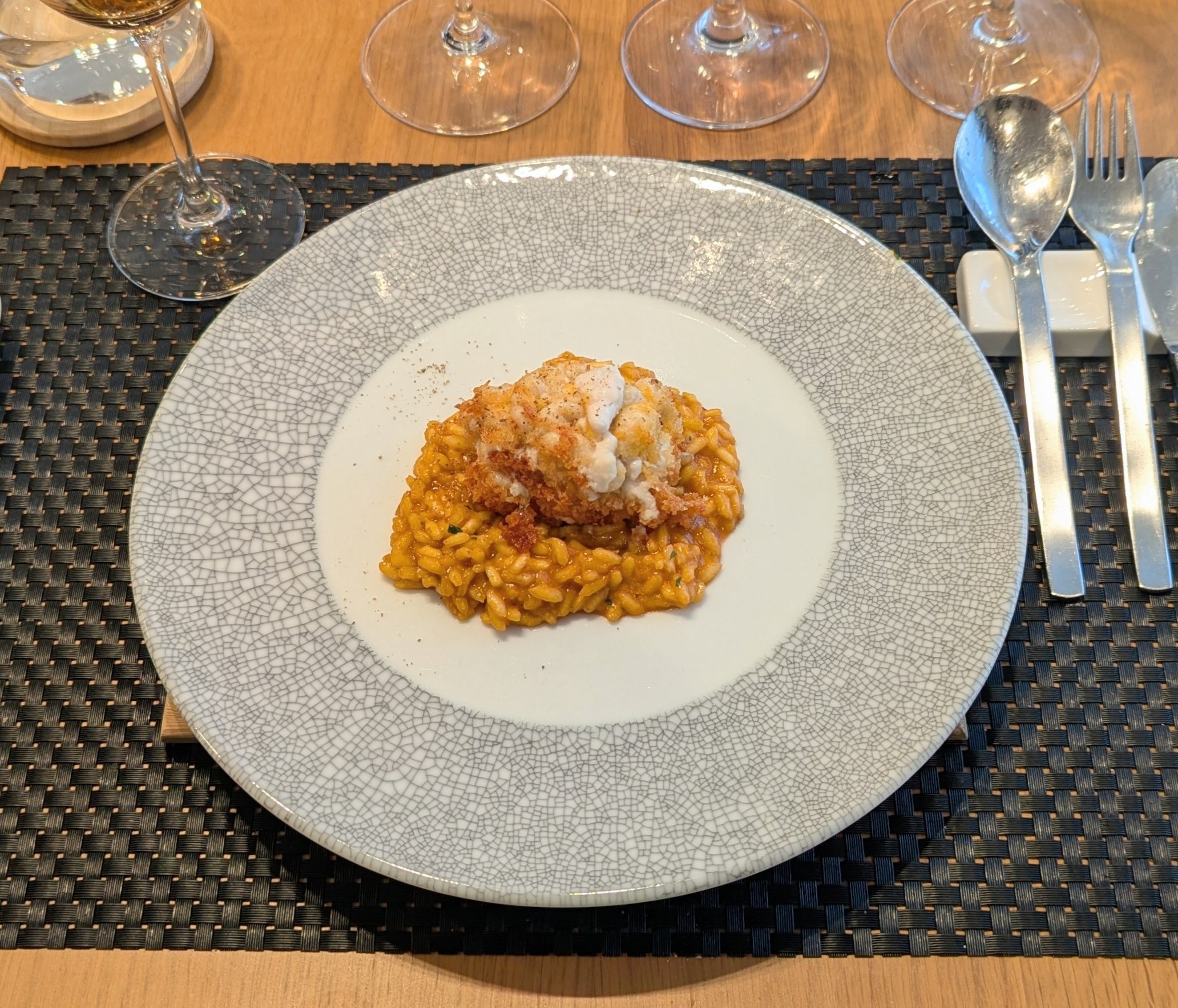 北海道釧路産の白子です。北海道の毛ガニや甘エビを使用したリゾット・スタイルで。これも混ぜ合わせてまいう~です。
