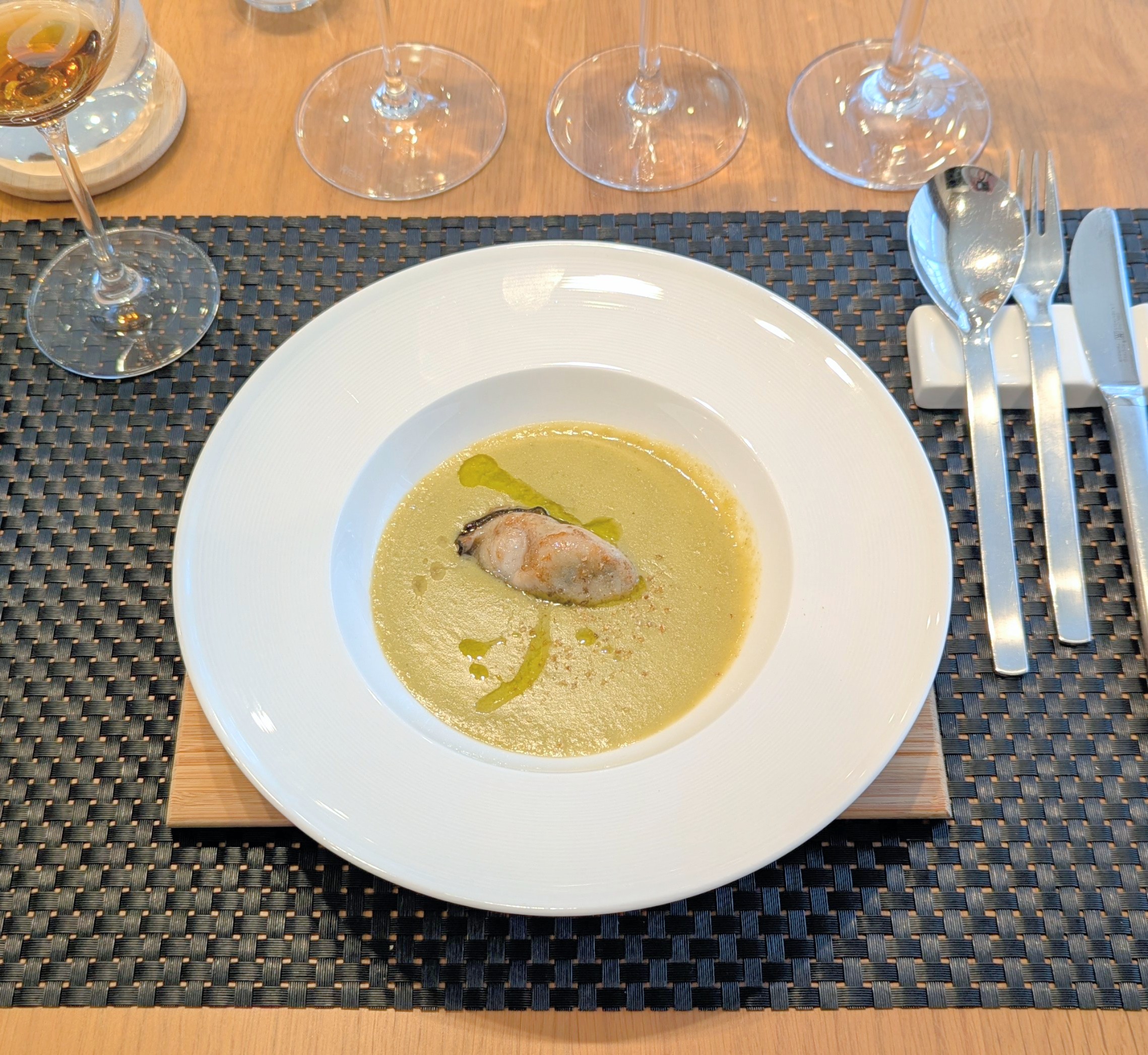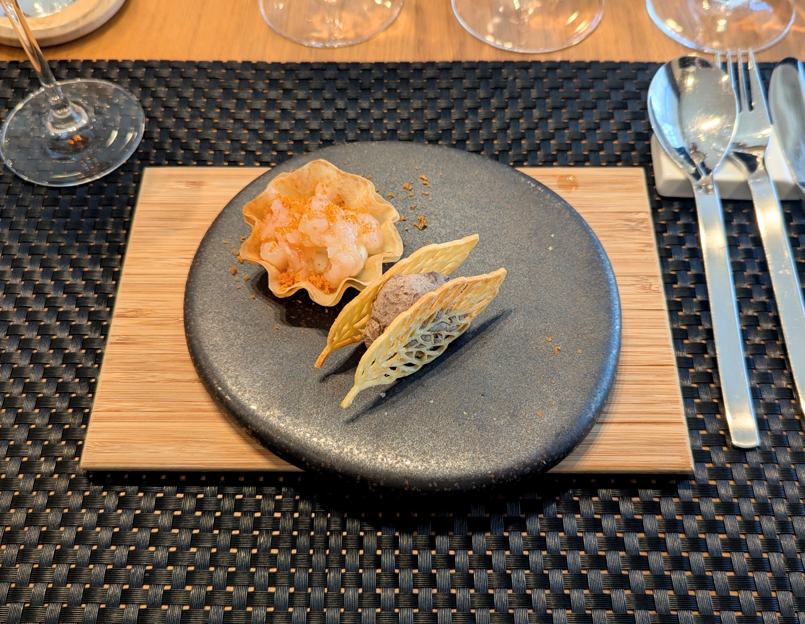 シュラムスバーグで乾杯。富山産の甘エビ(からすみかけ)で。そして「築地鳥藤」の特選鳥レバーのパテをなんとベリンジャーのナイチンゲールで。