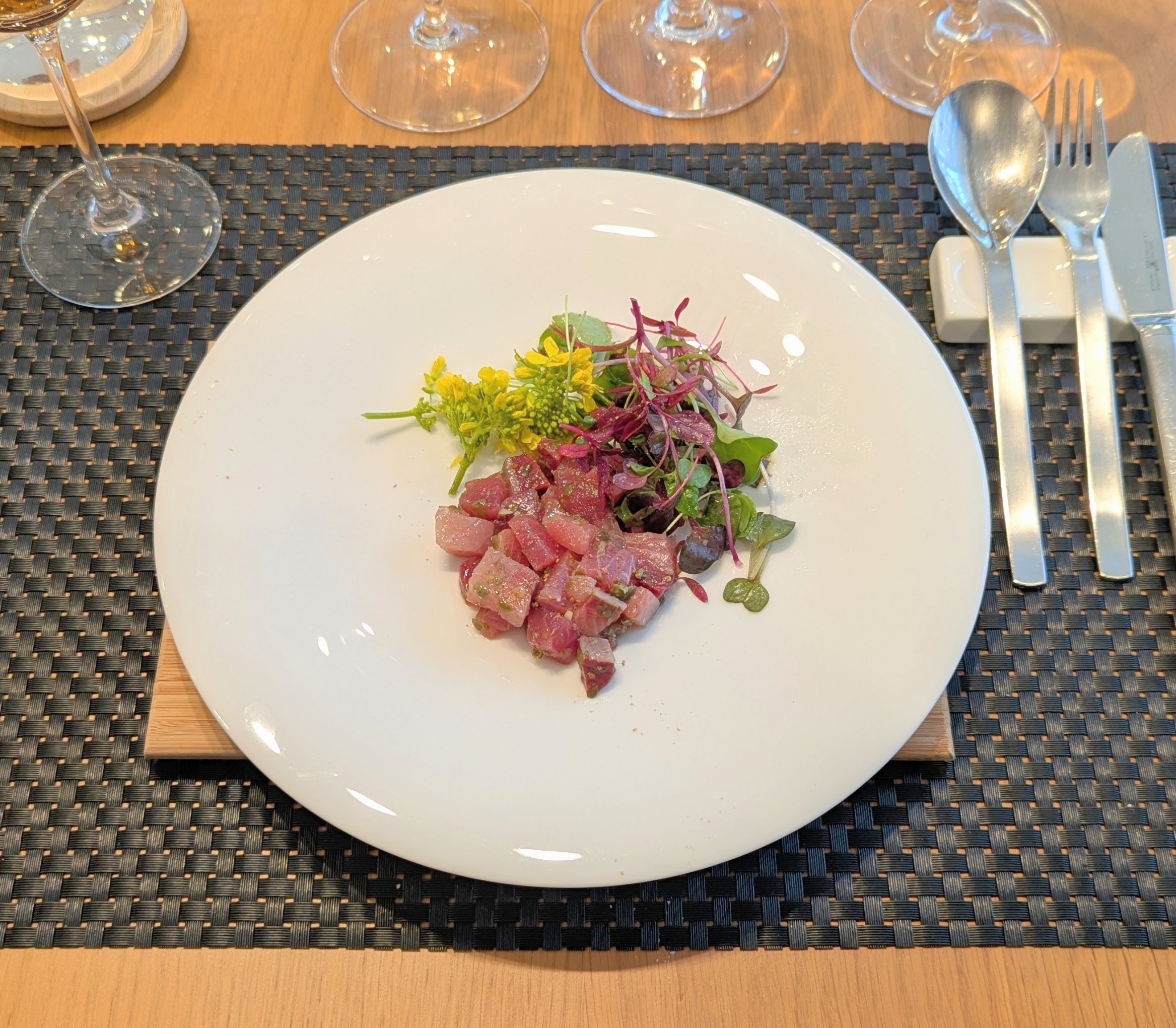 「のじ喜代」の京都産の天然鰤です。添えられたマイクロアマランスやマイクロコリアンダーと混ぜ合わせて。ブリが香りに包まれます。