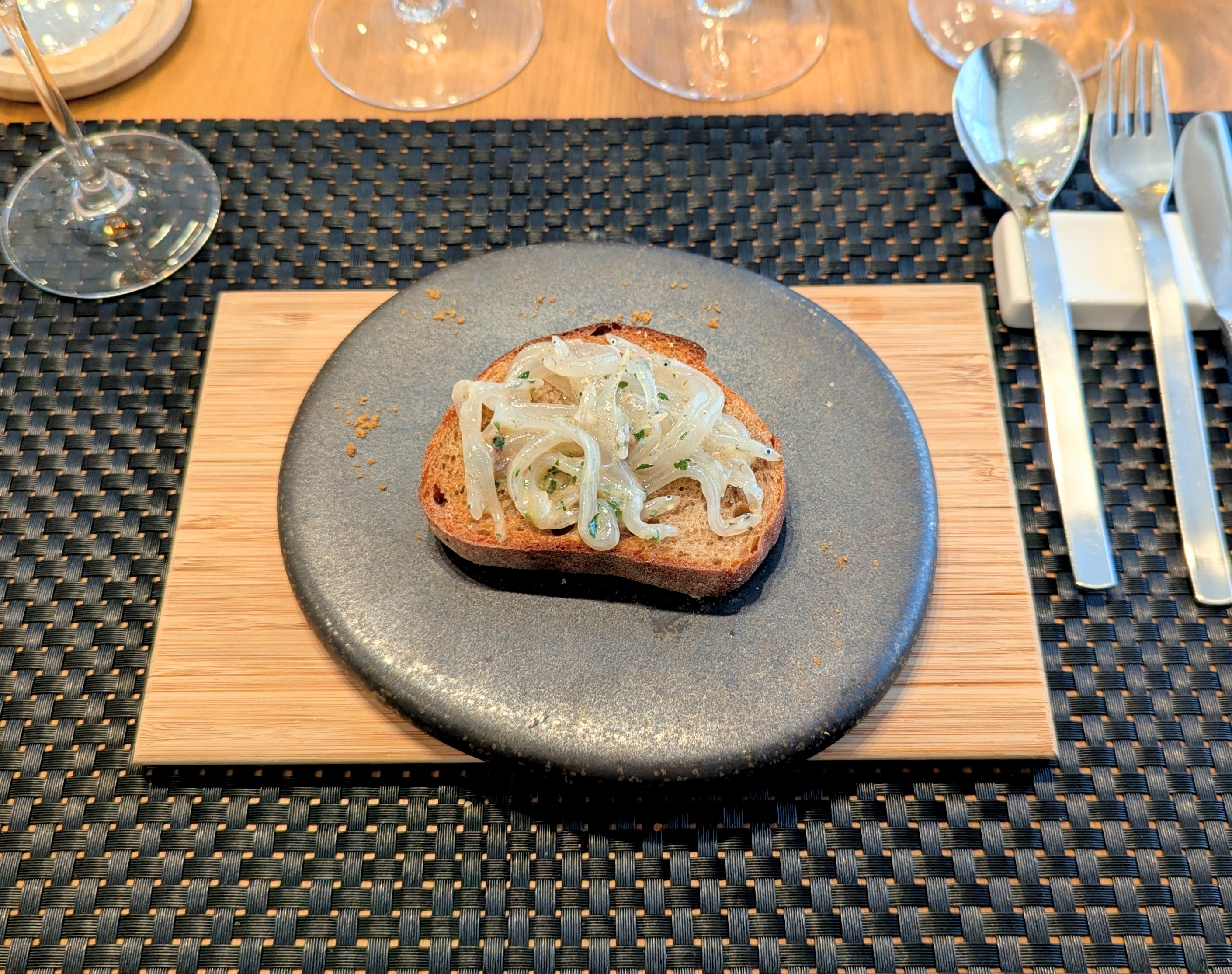 福島原釜港産の白魚です。アンチョビなどで味付けして全体的にはオリーブオイルで。レアなフロッグス・リープとコングスガードのソーヴィニヨン・ブランで。