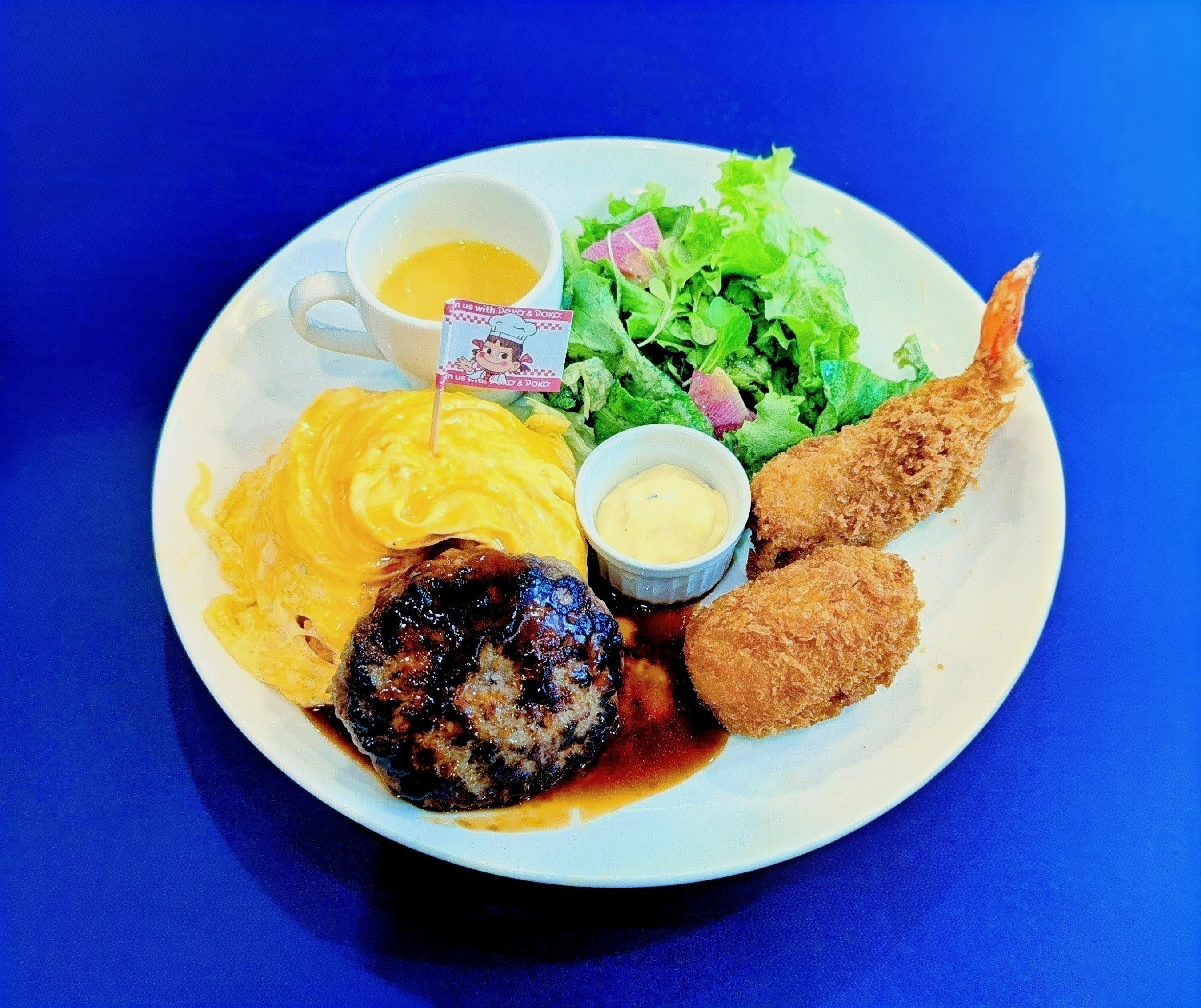大人のお子様ランチでございます。海老フライ、カニクリームコロッケ、ハンバーグ、オムレス、コーンポタージュ、サラダでございます。まいう~でございます。