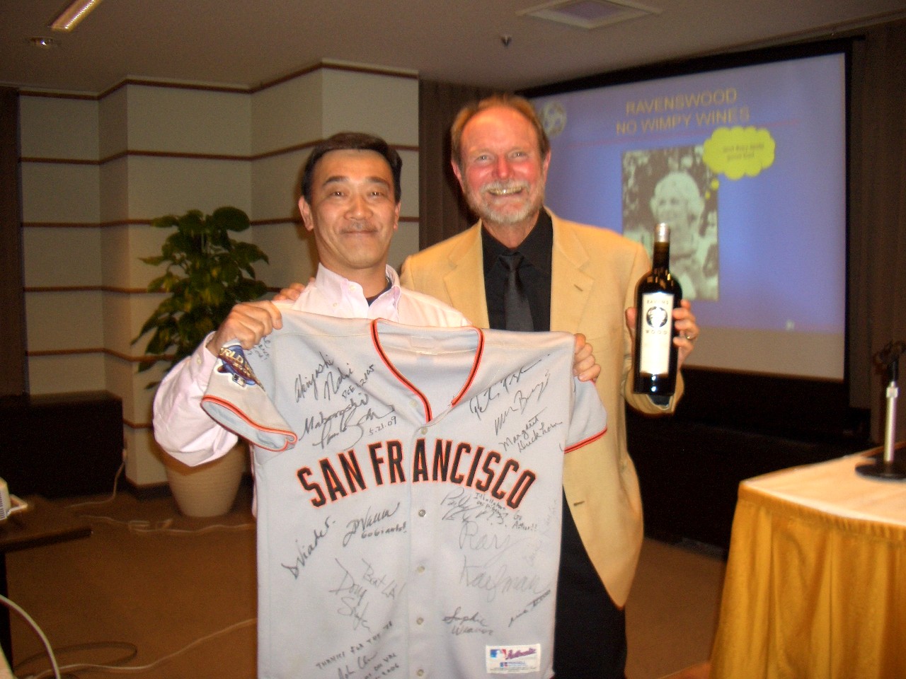 レイヴェンズウッドは訪問しています。ワイナリーへ行ってもオーナーに会えるわけではありませんがもしかしたらと思い。やはり会えませんでした(仕方なし 涙)。2006年2月レイヴェンズウッドの代表としてジョエル・ピーターソン氏来日。遂に憧れのワインメーカーの1人であるジョエルさんにお会いできました。ジョエルさんは、テンガロンハットにレイバンのサングラスで、という期待していたお姿ではありませんでしたが(苦笑)。サンフランシスコ育ちのジョエルさんは大のジャイアンツファンなので大笑いでサインしてくださいました。そして2009年11月に再会。ジャージをお見せしたら、再会を喜んでくださいました。