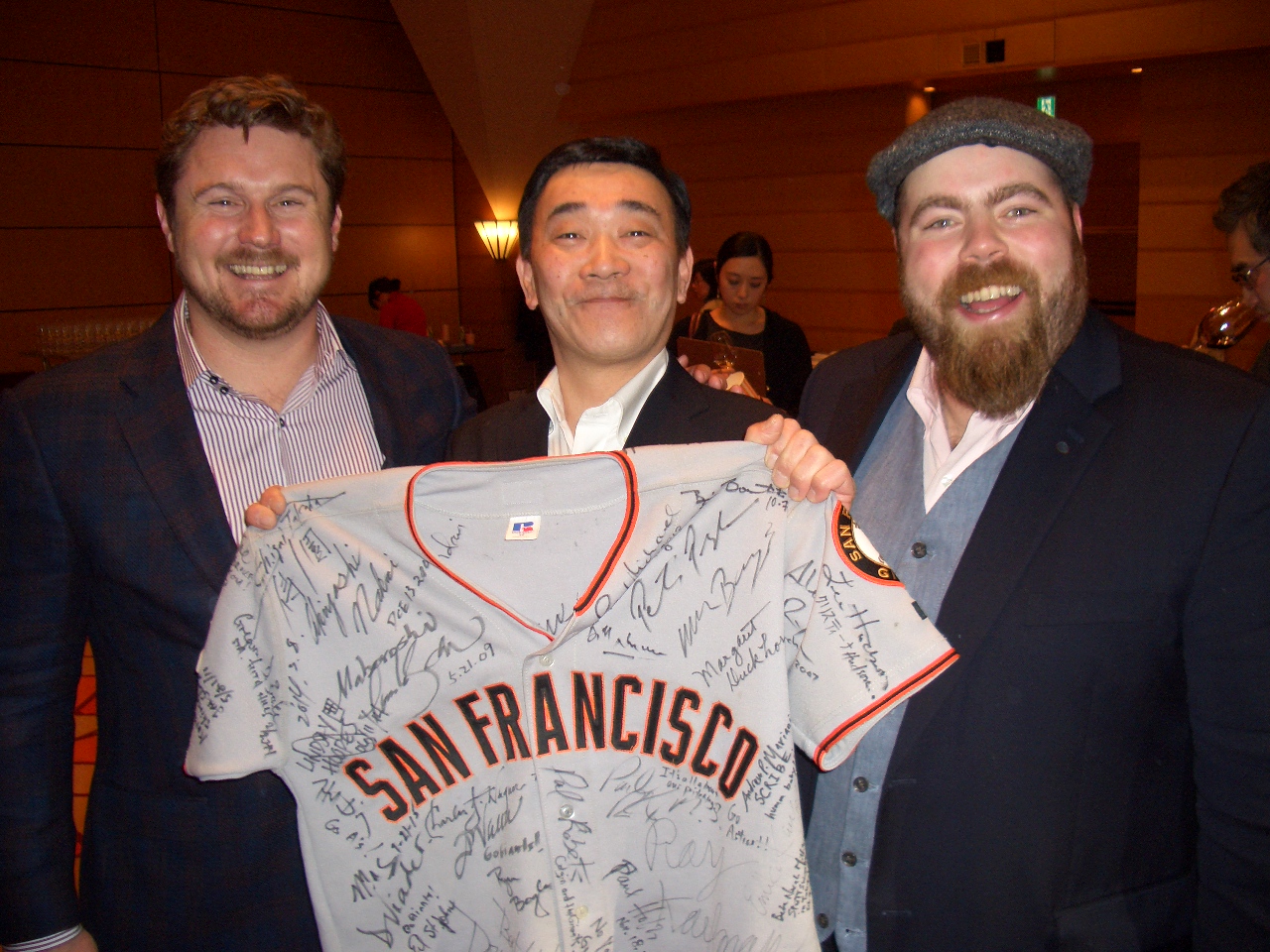 2016年2月ジョエルさんの息子で注目のワインメーカーのモーガン・ピーターソン氏来日。モーガンさんは父親のサインを見て苦笑してサインを書いてくださいました。そして2019年2月にジョエルさん&モーガンさん親子で来日。親子でセミナーを開催するのは世界で初めてだったとか。ジョエルさん、モーガンさん、そしてモーガンさんのパートナーのクリスさんと、めっちゃ楽しい記念撮影でした。