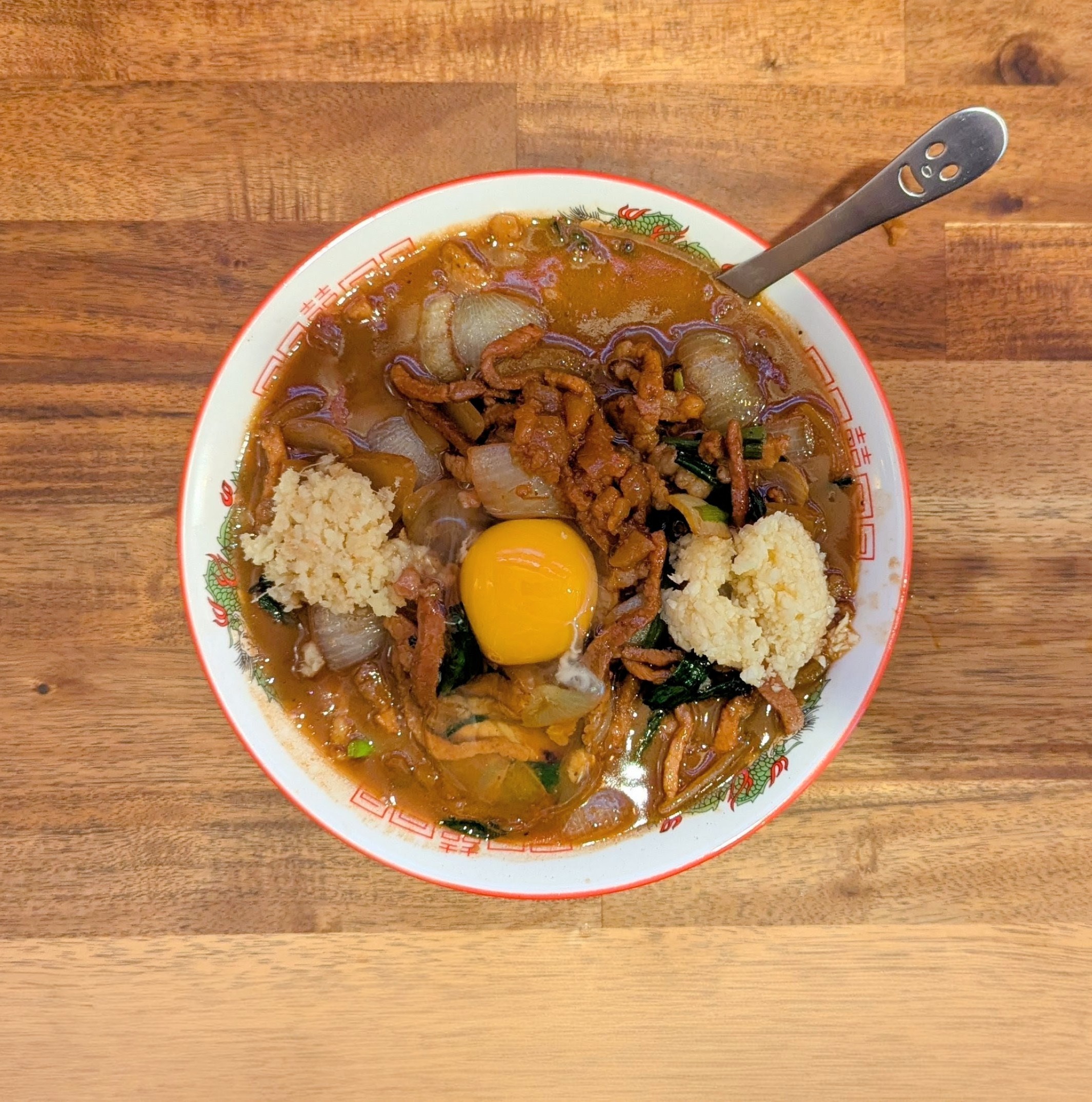 二郎系とか家系とか普段全く食べません。ここのシェフが作る料理は美味しいのです。ですから挑戦です。スタミナラーメン美味しかったです。ちょうど良い豚が入ったとかで、ホントに豚は美味しかったです。まあ見た目はやはり好きではありませんが(苦笑できない)。麺の上の生姜、大蒜、背脂はマシマシできます(苦笑)。