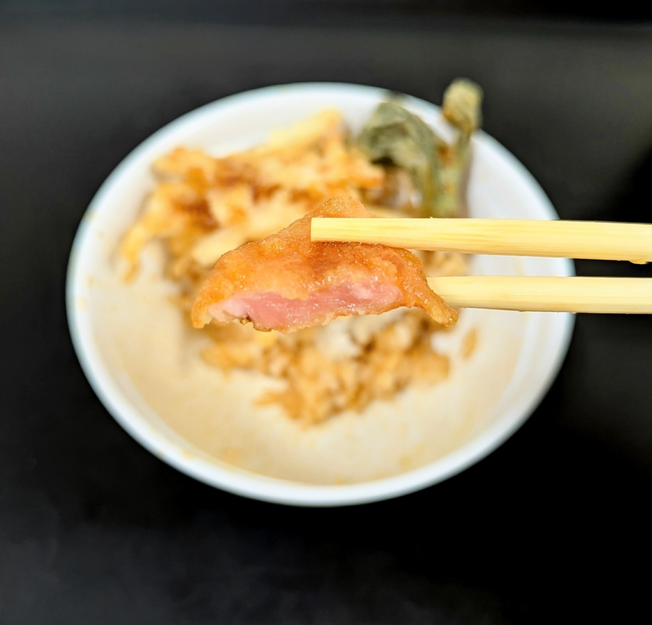 富山名物白えびの天丼です。タラの芽と赤かぶも入ってます。赤かぶがめっちゃ美味しかったです(苦笑)。汁物と香の物(生姜)付きです。