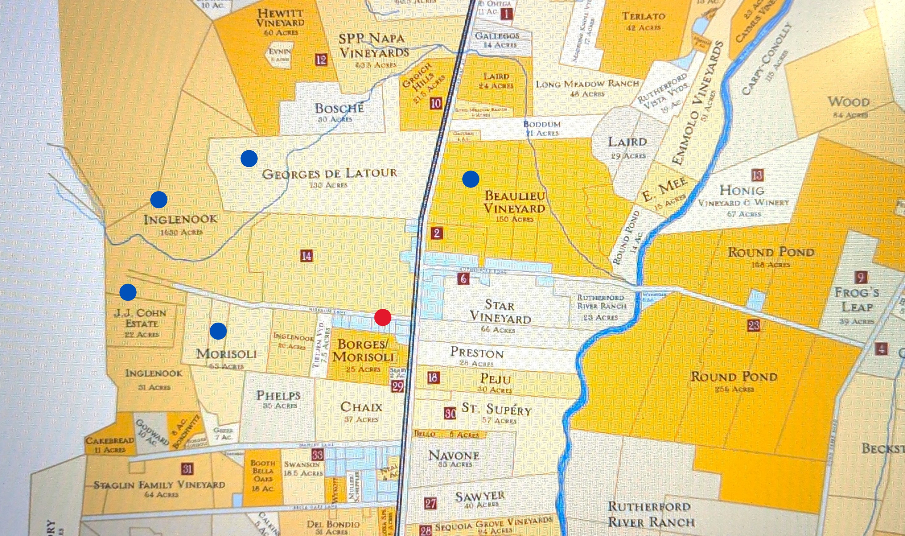 (ヴィンヤードマップの赤丸がトネラ・セラーズの畑とワイナリーがある場所です。青丸はご近所の素晴らしいワイナリーです。)