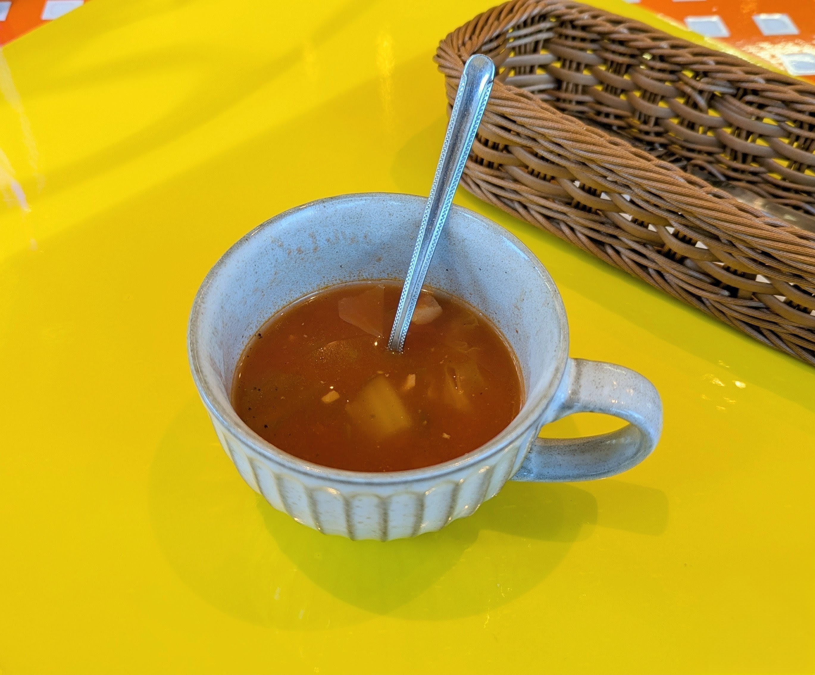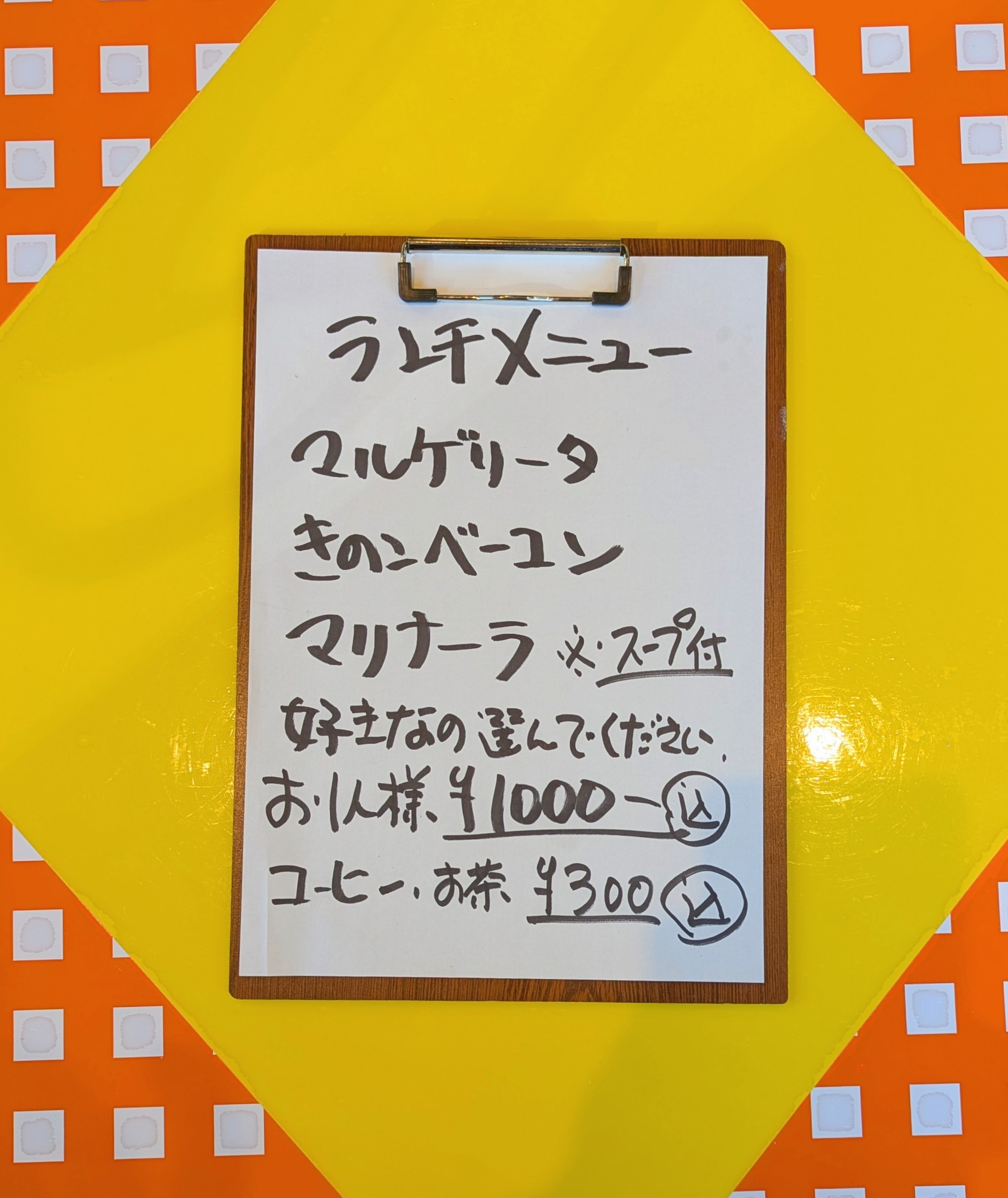 ランチピザはマルゲリータ、きのこベーコン、マリナーラの3種類です。夜営業で提供しているピザも出してくれるようです。ランチはスープ(ミネストローネ風)が付きます。