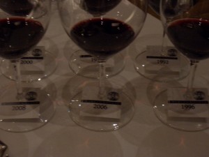今回は偶数年の10ヴィンテージ、プラス蔵出しの2012年の11ヴィンテージです。1992年(P96)、1994年(P100)、1996年(P97)、1998年(P95)、2000年(P92)、2002年(P100)、2004年(P98)、2006年(P96)、2008年(P96)、2010年(P98)、2012年(P98-100)。3本づつのグループに分けお料理と楽しみました。前回同様シェ・イノ(京橋)さんで開催されました。